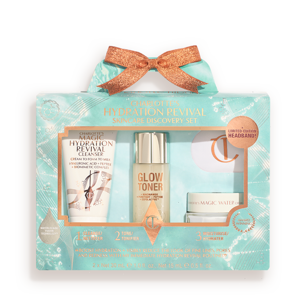 This kit includes my globally-loved Magic Hydration Revival Cleanser, Glow Toner and award-winning Magic Water Cream to cleanse, tone and moisturise, plus a spa-inspired white headband for ultimate relaxation!