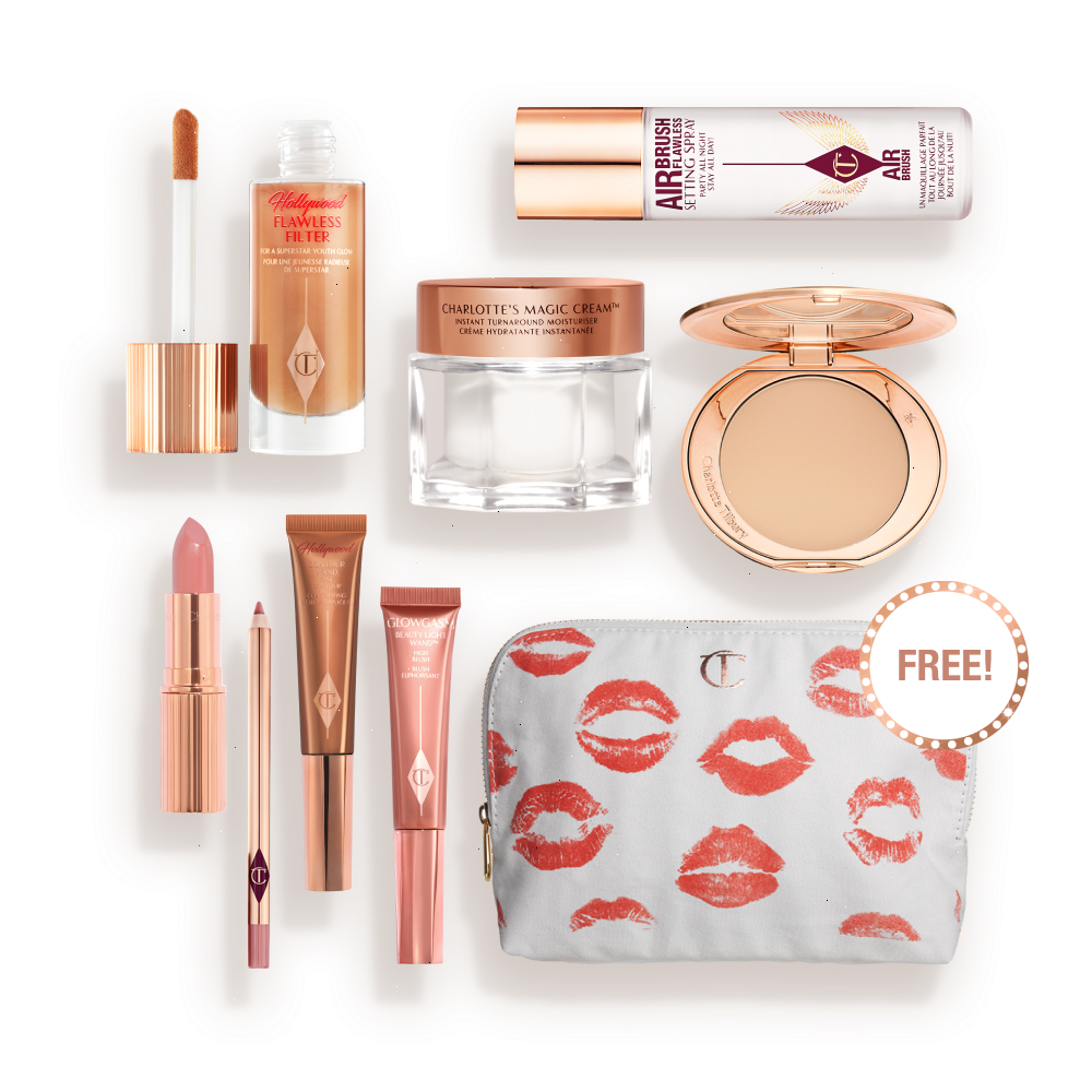 ONLY available on charlottetilburymart.com and the App, this kit includes 8 FULL-SIZED, LEGENDARY BEAUTY SECRETS! Discover the meaning of magic skin with Charlotte's Magic Cream; create a Hollywood superstar glow with my Beauty Light Wand, Hollywood Contour Wand, and Hollywood Flawless Filter; get the AIRbrush makeup fix with AIRbrush Flawless Finish and AIRbrush Flawless Setting Spray; and perfect your pout with my signature Pillow Talk lipstick look using Pillow Talk Lipstick and Lip Cheat. That's not all, darlings... You also get a FREE Hot Lips makeup bag to store your new must-haves!