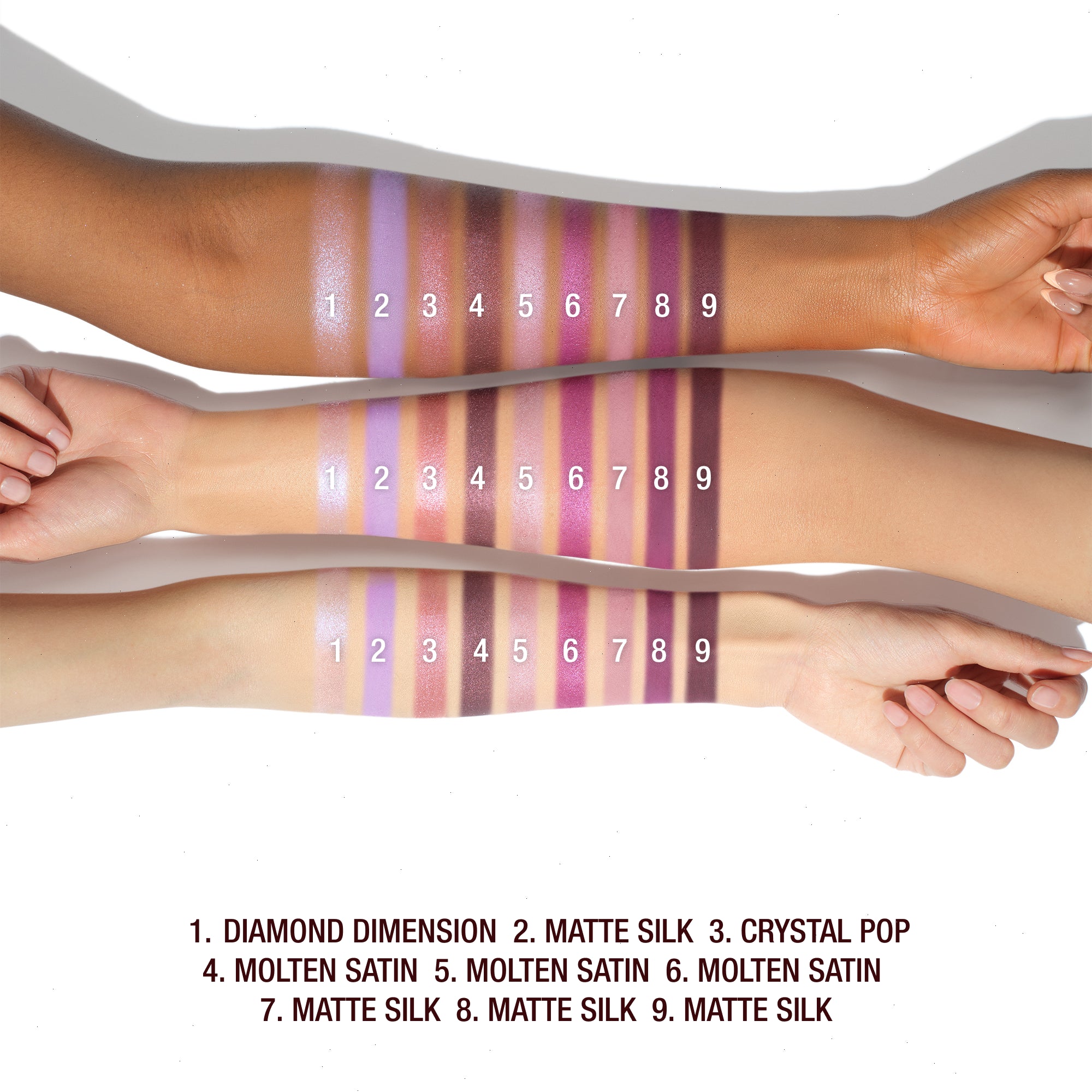 Don't be afraid of eyeshadow, darlings… My easy-to-apply, easy-to-blend and easy-to-layer shades do the work for you! Each of my limited-edition eyeshadow palettes features 5 super-flattering finishes designed to enhance the look of your eyes. The highly pigmented eyeshadows are in NEW! hypnotising textures for a multi-dimensional finish: Matte Silk, Crystal Pop, Diamond Dimension, Molten Satin and Crystal Chrome! Just swipe to dial up your look from desk to date to disco!