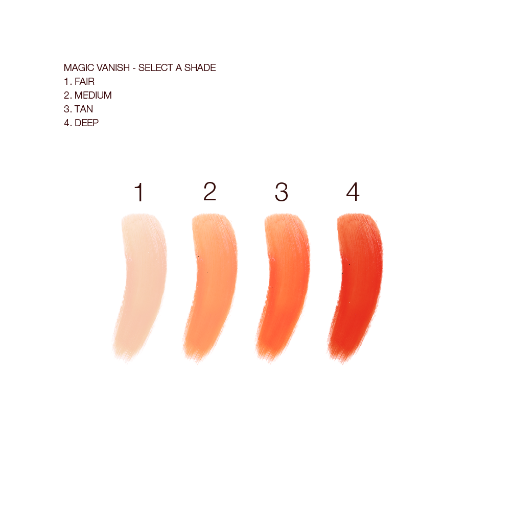 To conceal redness or pigmentation, apply Magic Vanish using the smaller end of Charlotte’s Hollywood Complexion Brush to any areas that need neutralising.