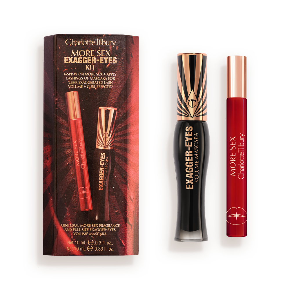 This kit includes my Exagger-Eyes Volume Mascara for bigger, thicker, longer looking lashes and a 10ml bottle of my globally-loved More Sex fragrance to unlock the secret to seduction!