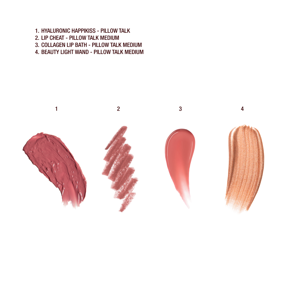 ONLY available on charlottetilburymart.com and the App, this kit includes 4 Pillow Talk Medium must-haves: travel-sized Lip Cheat, travel-sized Collagen Lip Bath and a travel-sized Beauty Light Wand in my warm, berry-pink shade, plus a full-sized Hyaluronic Happikiss balm in sheer shade Crystal Happikiss. Just glide and swipe for an easy Pillow Talk makeup look!