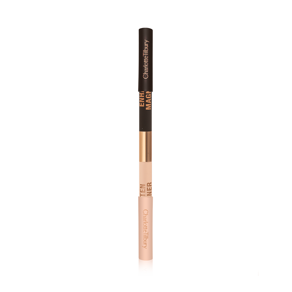 Darlings, my The Super Nudes Eye Liner Duo is the backstage secret to EXAGGERATED, BIGGER, BRIGHTER-LOOKING EYES! This black-brown and nude eyeliner duo allows you to PLAY WITH LIGHT and DARK, brightness and shade, to create a more FELINE, MESMERIC EYE that’s perfect with a natural nude makeup look!