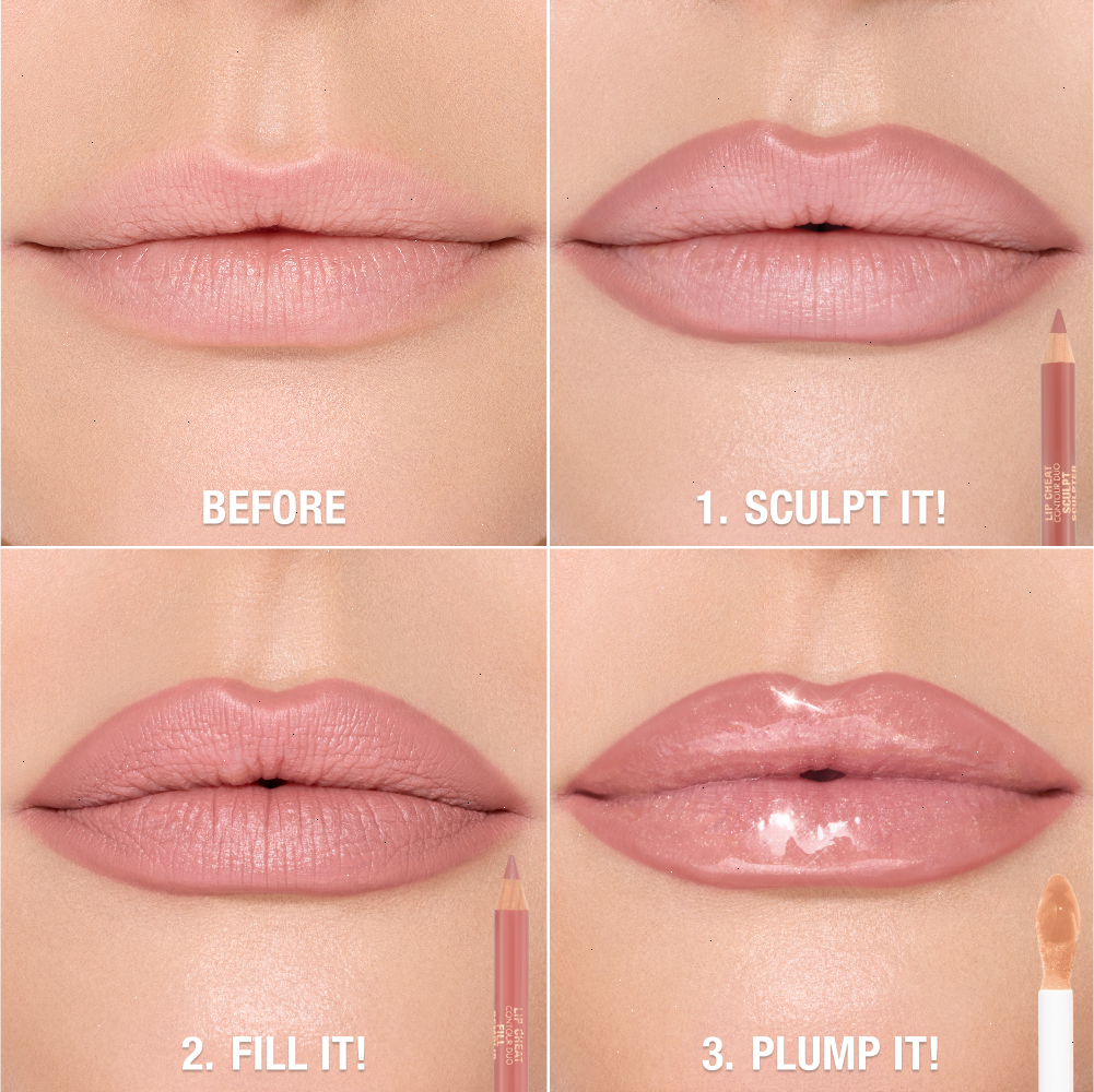 Lip Cheat Contour Duo is my 2-in-1 nude lip liner that's designed to create the perfect lip contour effect. The SCULPT shade is a powdery formula in a deeper shade that's perfect for outlining lips and adding definition to your lip shape, and the creamy FILL shade is a lighter tone for you to shade in your lips with. The two blend seamlessly to create a super-flattering effect in super-wearable, super nude shades that give you a 90s supermodel pout.