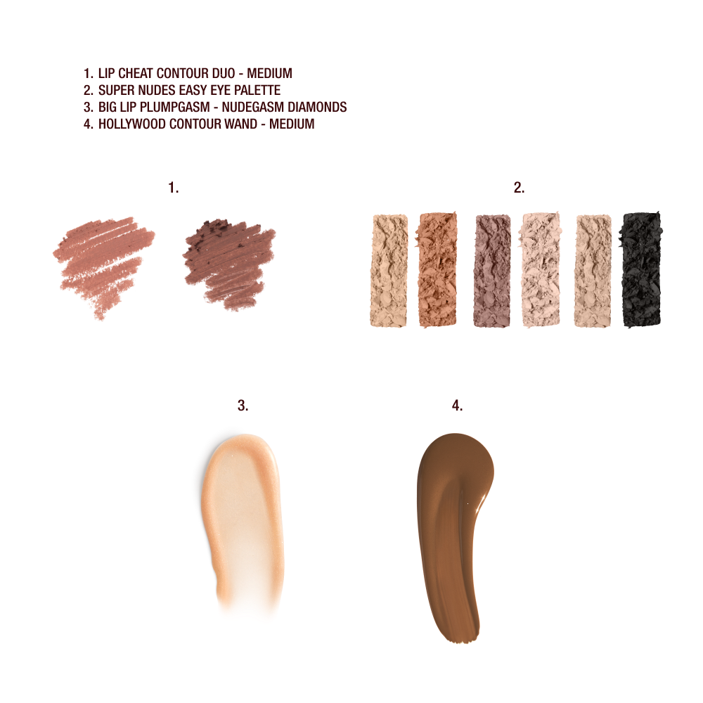 ONLY available on charlottetilburymart.com and the App, this kit includes four beauty secrets for the ultimate Super Nudes makeup magic look. Discover my Lip Cheat Contour Duo + Big Lip Plumpgasm in Nudegasm Diamonds for a defined, plumper-looking pout, the Super Nudes Easy Eye Palette with 6 velvet-matte shades for sultry, smokey eyes, plus my Hollywood Contour Wand for a buildable, blendable liquid contour that sculpts the look of red carpet cheekbones.