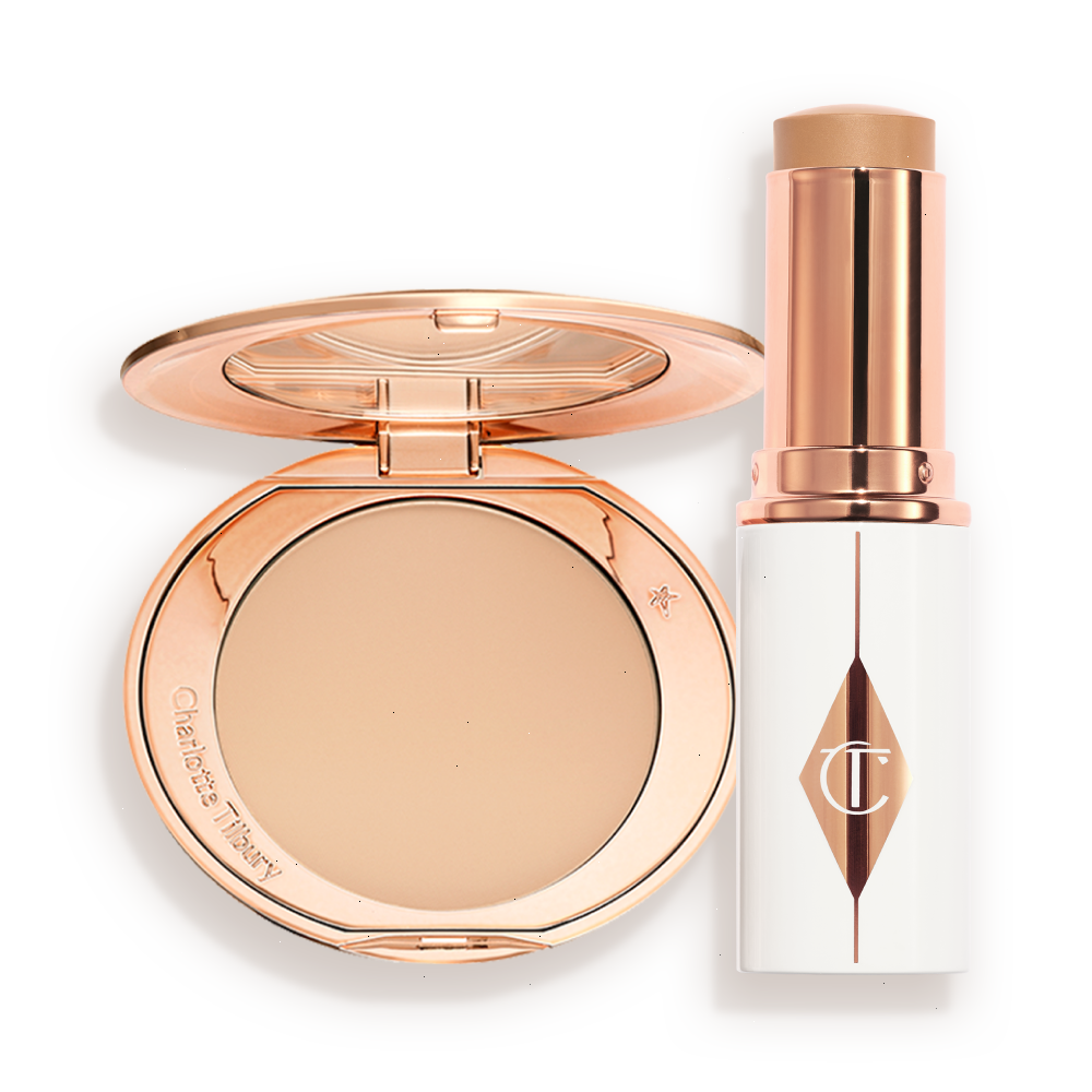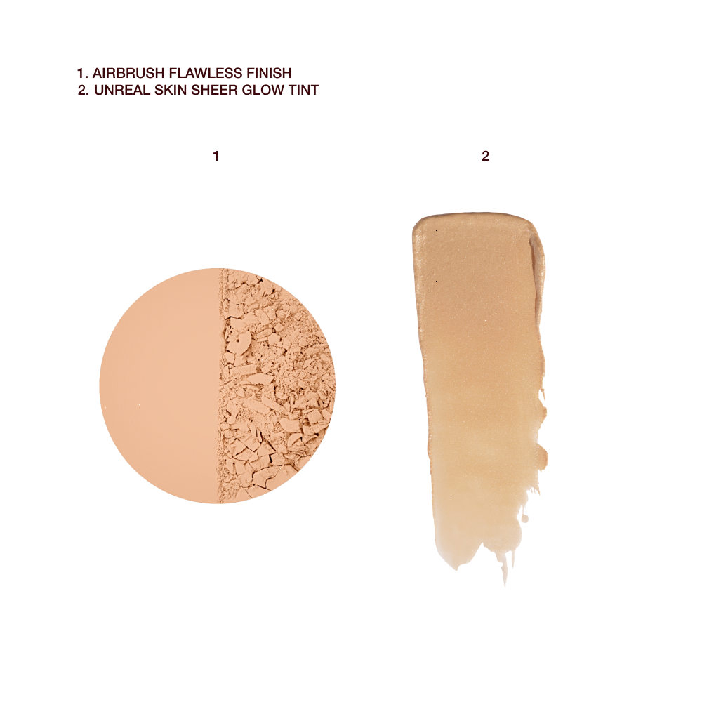 Darlings, do you want to know the secret to UNREAL SKIN? Discover my Unreal Skin Sheet Glow Tint Hydrating Foundation Stick, it blurs and smooths for a RING LIGHT-EFFECT! It's the ULTIMATE NO-FOUNDATION FOUNDATION! This kit combines my NEW! hydrating foundation stick, Unreal Skin Sheer Glow Tint with my AWARD-WINNING cashmere-soft finishing powder. It's 2 steps to a no-foundation makeup look with natural-looking radiance and a soft-focus skin glow!